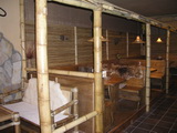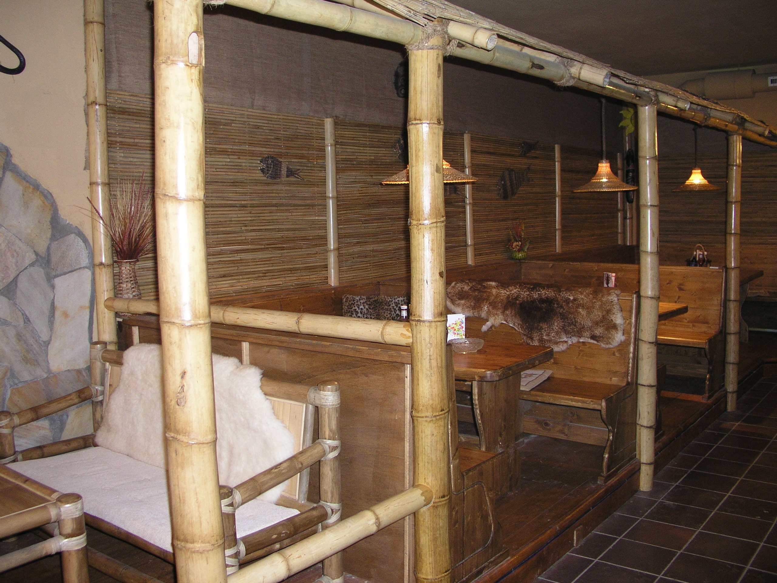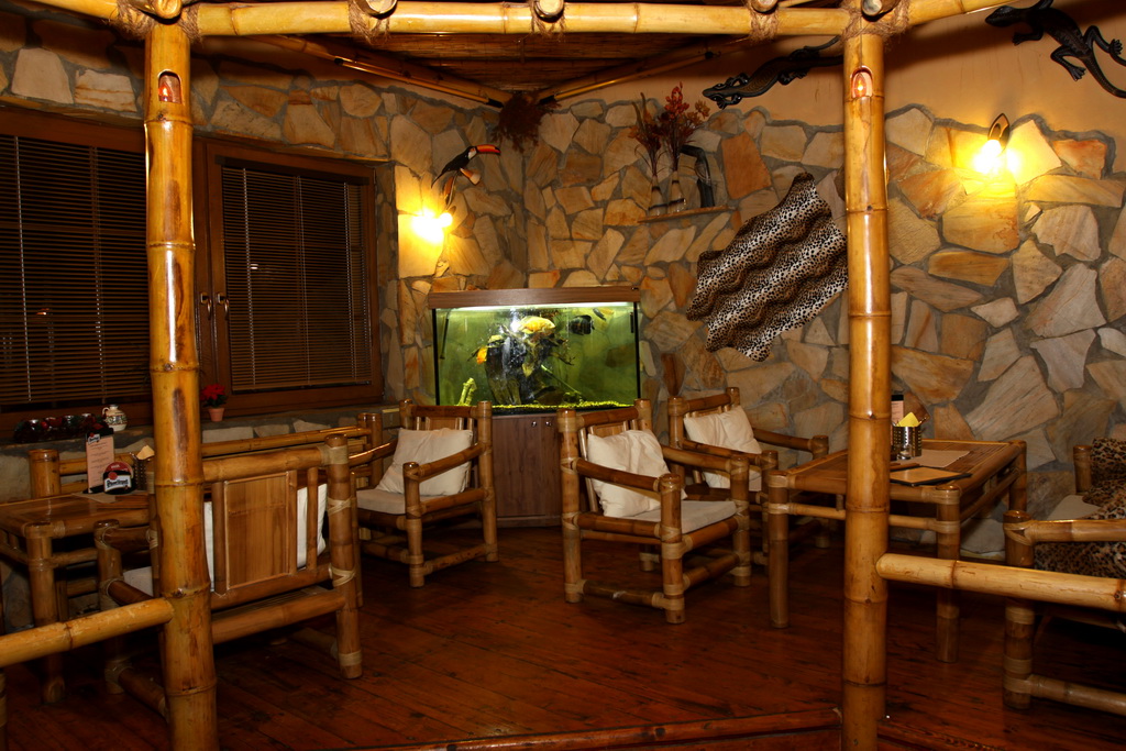 Nekuřácká vinárna Africa je celá stylově řešená, včetně bambusových křesel, rákosových stropů a doplňků.